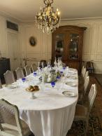Dans la salle à manger aux boiseries Louis XV et aux trumeaux d'époque, une riche table est ornée de cristallerie Saint Louis.